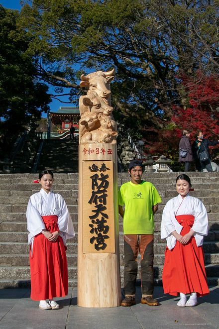 本年もログハウス建築家林隆雄氏がチェーンソーを操り、太柱に干支の「午」の彫刻を施した「干支の御柱」を製作し奉納致します。林氏は防府市出身で「U.S.OPEN CHAINSAW SCULPTURE CHAMPIONSHIP 2012、2013、2015、2016、2025」で5度も優勝し、世界で活躍をしておられます。